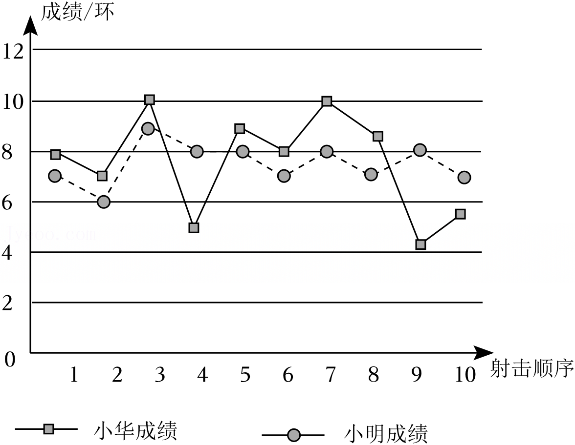 244241. (2023•师大附中•八上期末) 小华、小明两位射击运动员在选拔赛中各射击10次的成绩如图所示,他们的平均成绩均为7.5环,若小华射击10次成绩的方差为,小明射击10次成绩的方差为,则          .(填“>,<,=”)