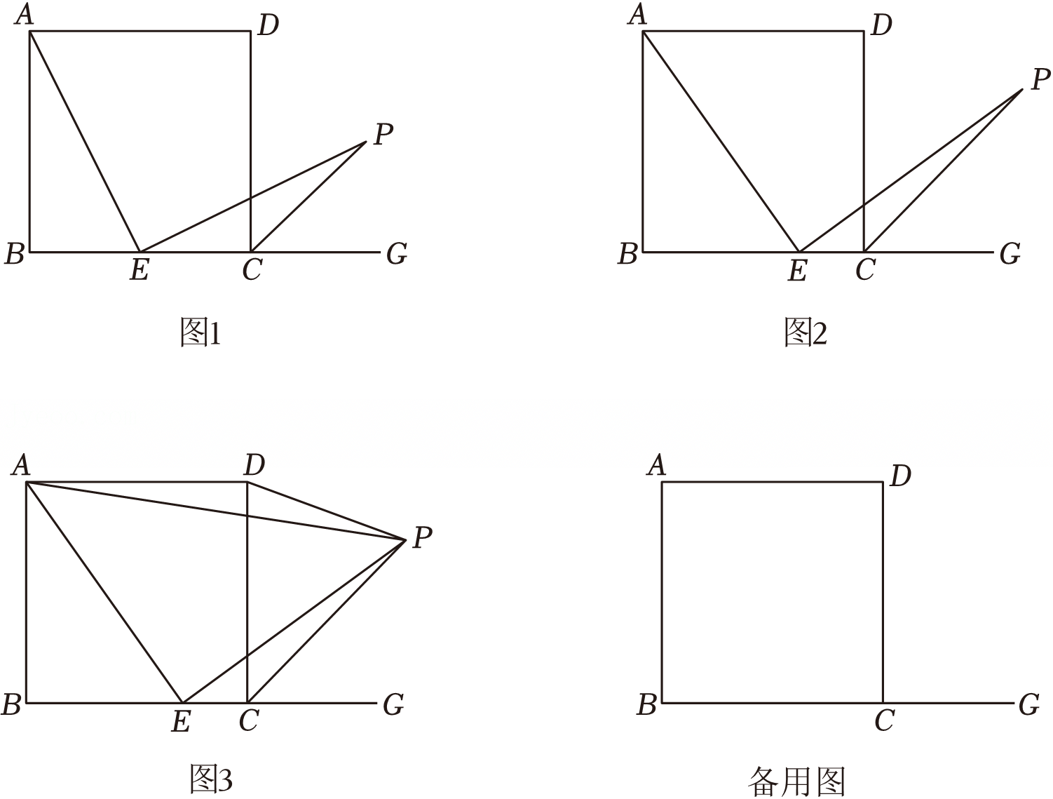 244454. (2023•高新一中•八下期末) 【问题情境】数学活动课上,老师出示了一个问题:如图,在正方形ABCD中,E是射线BC上一动点(点EB不重合),连接AE,作AEEPEP与正方形的外角∠DCG的平分线交于P点.