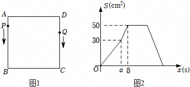246578. (2023•铁一中学•九上期末) 如图1,在边长为10cm的正方形ABCD中,点P从点A出发,沿A→B→C→D路线运动,到点D停止;点Q从点D出发,沿D→C→B→A路线运动,到点A停止.若点P、点Q同时出发,点P的速度为每秒lcm,点Q的速度为每秒2cm,a秒时点P、点Q同时改变速度,点P的速度为每秒2cm,点Q的速度为每秒1cm,图2是点P出发x秒后△APD的面积S(cm2)与x(s)关系的图象.