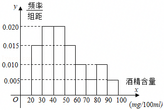 根据《中华人民共和国道路交通安全法》规定:车辆驾驶员血液酒精浓度在20~80mg/100ml(不含80)之间,属于酒后驾车,处暂扣一个月以上三个月以下驾驶证,并处200元以上500元以下罚款;血液酒精浓度在80mg/100ml(含80)以上时,属醉酒驾车,处十五日以下拘留和暂扣三个月以上六个月以下驾驶证,并处500元以上2000元以下罚款.据《法制晚报》报道,2009年8月15日至8月28日,全国查处酒后驾车和醉酒驾车共28800人,如图是对这28800人酒后驾车血液中酒精含量进行检测所得结果的频率分布直方图,则属于醉酒驾车的人数约为( )