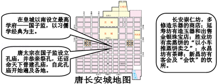 (1)长安城面貌在一定程度上反映了唐朝的时代特点。从《唐长安城地图》看出:基本形成了各市坊围绕皇宫的布局,表明其政治特点是:     ;城内设有国子监、建有孔庙,表明其思想特点是:     ;对几个“坊”的描述可看出其社会经济特点是: