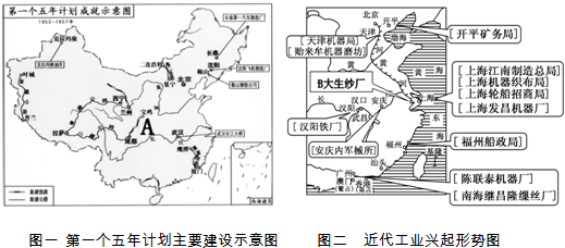 (4)图一A铁路名称是什么?图二B企业属于哪种性质?运用所学知识分析图一和图二重工业在地域分布上不同的原因。