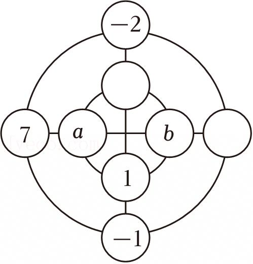 小新同学发明了一种游戏,将0,﹣1,1,5,6,7,﹣8分别填入图中的圆圈内,使横、竖以及内外两圈上的4个数字之和都相等.他已经将﹣1,1,7这四个数填入了圆圈,则图中a+b的值为 .