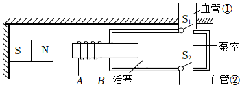 人工心脏泵可短时间代替心脏工作,如图是该装置的示意图,磁体固定在左侧,线圈AB固定在用软铁制成的活塞柄上(相当于一个电磁铁),活塞筒通过阀门与血管相通,阀门S1只能向外开启,S2只能向内开启,线圈中的电流从A流向B时,电磁铁左端是 极,血液会 (选填“流入”或“流出”)活塞筒,该装置工作时,线圈AB中的电流方向 (选填“需要”或“不需要”)改变。