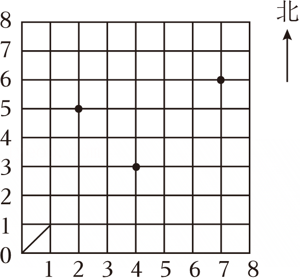 如图,已知其中一个小正方形的对角线长10cm,点A的位置用数对(1,5)表示,则点(0,0)北偏东45°方向40cm处是点 ;点A南偏东45°方向30cm处是点 。
