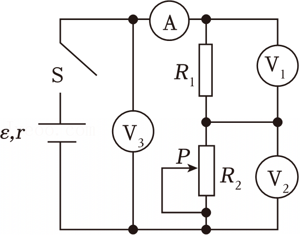 在如图所示电路中,定值电阻阻值R大于电源内阻阻值r。闭合电键K,当滑动变阻器的滑动触头P向下滑动时,理想电压表V1、V2、V3示数变化量的绝对值分别为ΔU1、ΔU2、ΔU3,理想电流表A示数变化量的绝对值为ΔI,则( )