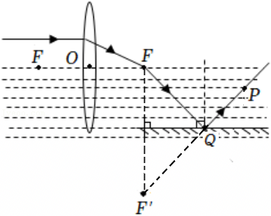 如图所示,凸透镜的主光轴与水面重合,F是凸透镜的焦点,水下有一块平面镜M,一束与水面平行的光线经凸透镜折射后进入水中,再经水中的平面镜反射后恰过P点,请将光路图补充完整。