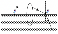 如图所示,凸透镜的主光轴与水面重合,F是凸透镜的焦点,水下有一块平面镜M,一束与水面平行的光线经凸透镜折射后进入水中,再经水中的平面镜反射后恰过P点,请将光路图补充完整。