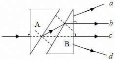 如图所示,两块完全相同的直角三角形玻璃砖A和B放置在同一水平面内,斜边平行且相距一定距离。一条光线从空气中垂直于玻璃砖A的直角边射入,从玻璃砖B的直角边射出,射出后的位置和方向可能是图中的( )