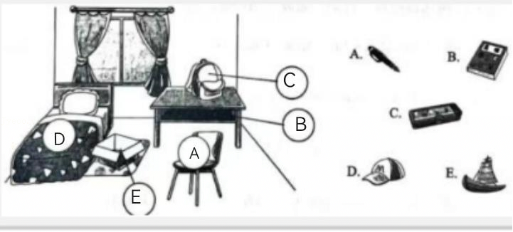 222406.(2024•灞桥区•三下期末)请帮助Chen Jie把她的物品归位,将序号填入相应的圆圈内。 Hello,I'm Chen Jie.Look!This is my room.My bag is on the desk.And my pencil box is in the bag.My book is in the desk.My pen is on the chair.I have a new cap.It's on the bed.Where is my toy boat?Aha!It's in the box.I like it very much.