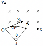 一电子(e,m)以速度v0与x轴成30°角垂直射入磁感应强度为B的匀强磁场中,经一段时间后,打在x轴上的P点,如图所示,则P点到O点的距离为多少?电子由O点运动到P点所用的时间为多少?