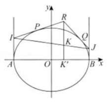 230591. (2025•西工大附中•十三模) .已知椭圆C的长轴是短轴的倍,且椭圆上一点到焦点的最远距离为3,AB是椭圆左右顶点,过AB作椭圆的切线,取椭圆上x轴上方任意两点PQPQ的左侧),并过PQ两点分别作椭圆的切线交于R点,直线RP交点A的切线于I,直线RQ交点B的切线于J,过RAB的垂线交IK